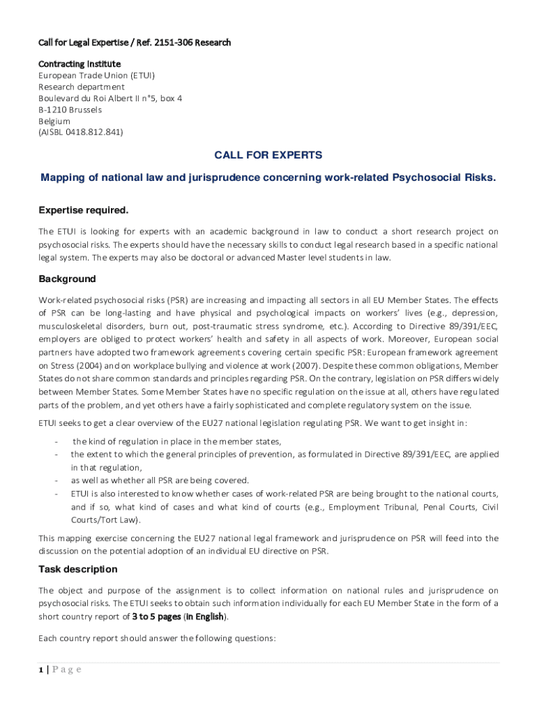 Call for Legal Expertise / Ref. 2151306 Research Contracting Institute European Trade Union (Étui) Research department Boulevard Du ROI Albert II n5, box 4 B1210 Brussels Belgium (ASBL 0418.812.841)CALL