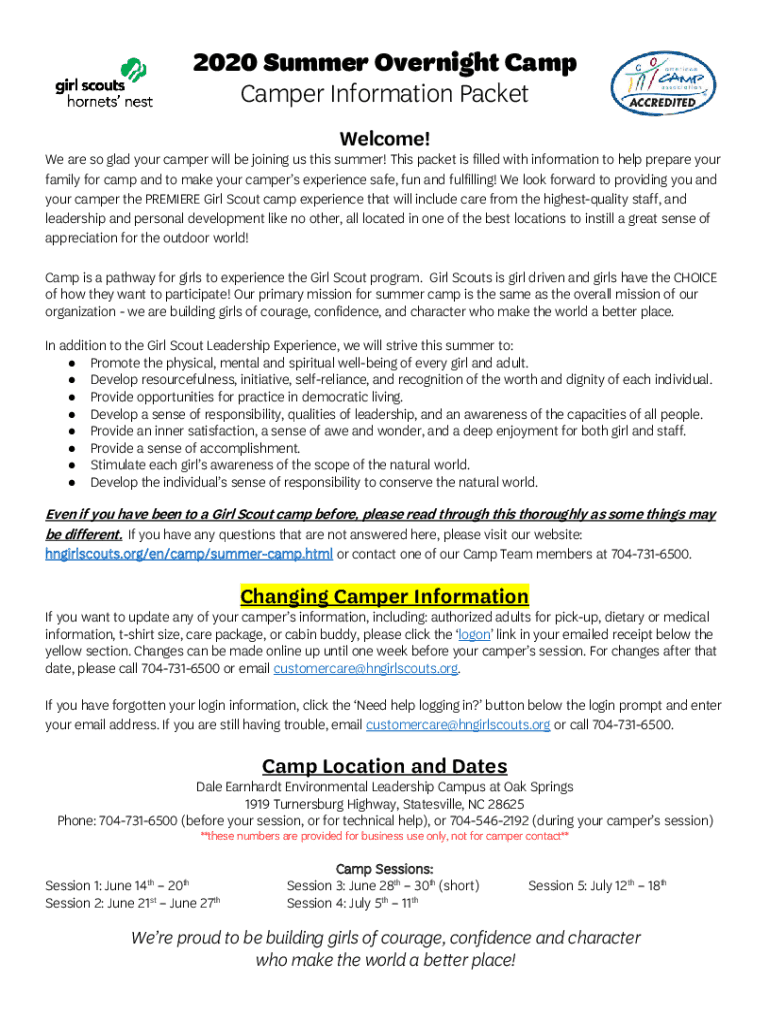 2020 Summer Overnight Camp Camper Information Packet Welcome! We are so glad your camper will be joining us this summer! This packet is filled with information to help prepare your family for camp