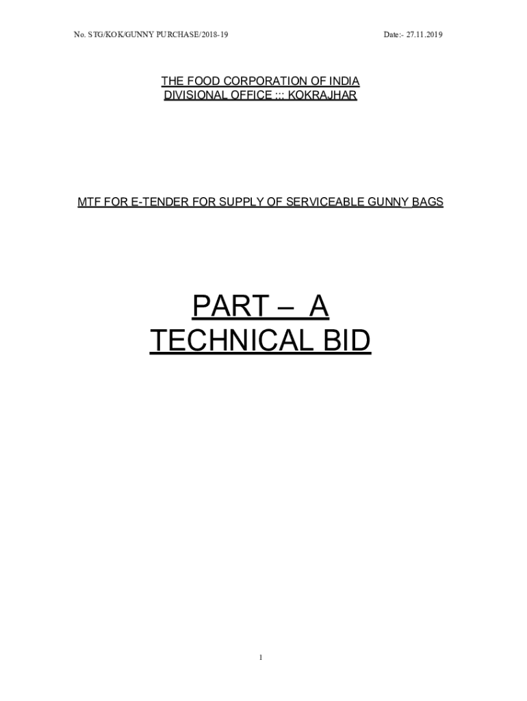 No. STG/KOK/GUNNY PURCHASE/201819Date: 27.11.2019THE FOOD CORPORATION OF INDIA DIVISIONAL OFFICE ::: KOKRAJHARMTF FOR TENDER FOR SUPPLY OF SERVICEABLE GUNNY APART A TECHNICAL BID1No. STG/KOK/GUNNY