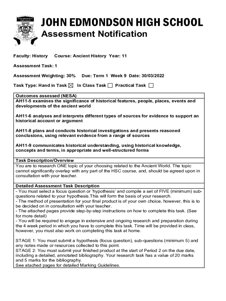 JOHN EDMONDSON HIGH SCHOOL Assessment Notification Faculty: HistoryCourse: Ancient History Year: 11Assessment Task: 1 Assessment Weighting: 30% Task Type: Hand in Take: Term 1 Week 9 Date: 30/03/2022