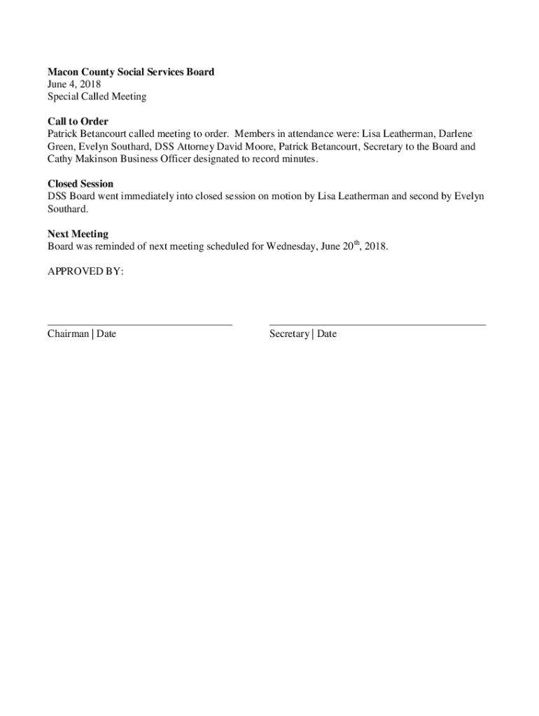 Macon County Social Services Board June 4, 2018, Special Called Meeting Call to Order Patrick Betancourt called meeting to order. Members in attendance were: Lisa Weatherman, Darlene Green, Evelyn
