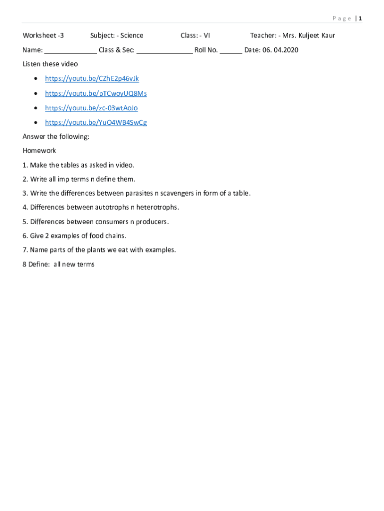 Page |1Worksheet 3Subject: ScienceClass: Teacher: Mrs. Kuldeep Surname: ___ Class & Sec: ___ Roll No. ___ Date: 06. 04.2020 Listen these video https://youtu.be/CZhE2p46vJkhttps://youtu.be/pTCwoyUQ8Mshttps://youtu.be/zc03wtAoJohttps://youtu.be/YuO4WB4SwCgAnswer