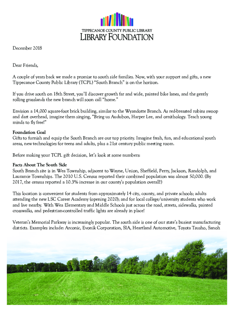 December 2018 Dear Friends, A couple of years back we made a promise to south side families. Now, with your support and gifts, a new Tippecanoe County Public Library (TPL) South Branch is on the horizon.