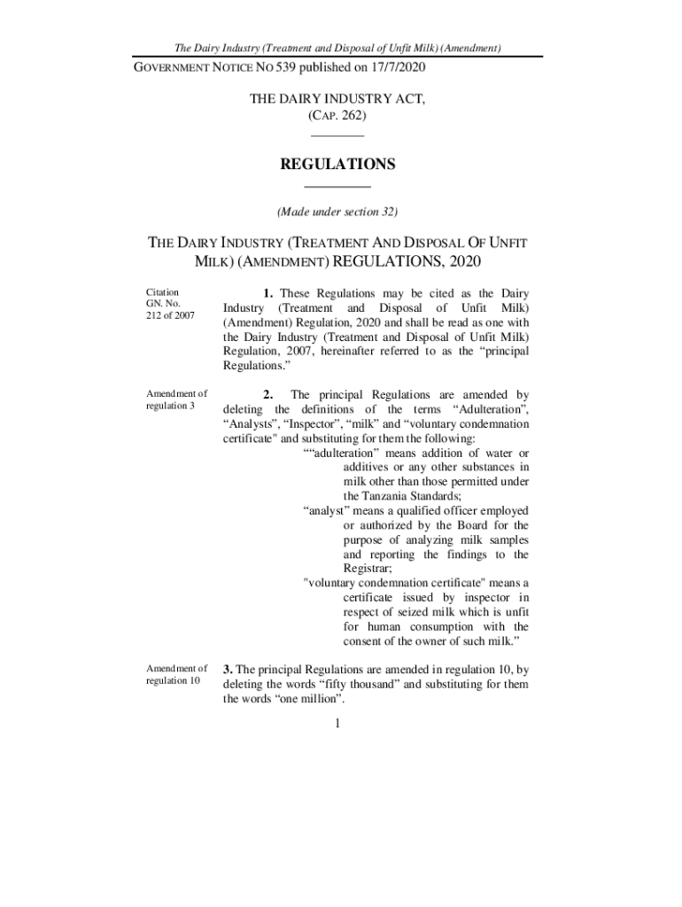 The Dairy Industry (Treatment and Disposal of Unfit Milk) (Amendment)GOVERNMENT NOTICE NO 539 published on 17/7/2020 THE DAIRY INDUSTRY ACT, (CAP. 262) ___REGULATIONS ___ (Made under section 32)THE