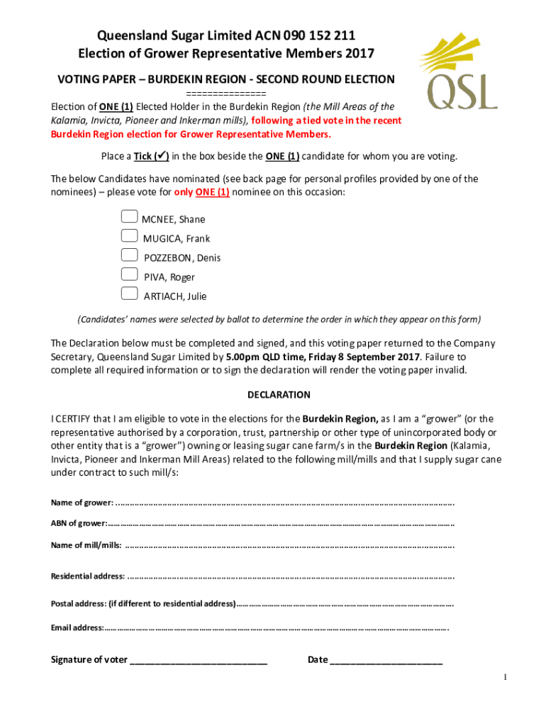 Queensland Sugar Limited ACN 090 152 211 Election of Grower Representative Members 2017 VOTING PAPER BURDEN REGION SECOND ROUND ELECTION of ONE (1) Elected Holder in the Burden Region (the Mill Areas