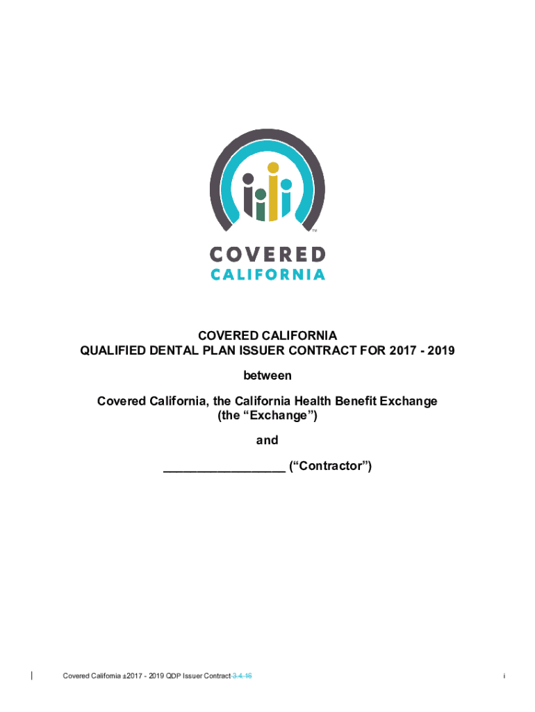COVERED CALIFORNIA QUALIFIED DENTAL PLAN ISSUER CONTRACT FOR 2017 2019 between Covered California, the California Health Benefit Exchange (the Exchange) and ___ (Contractor)Covered California 2017