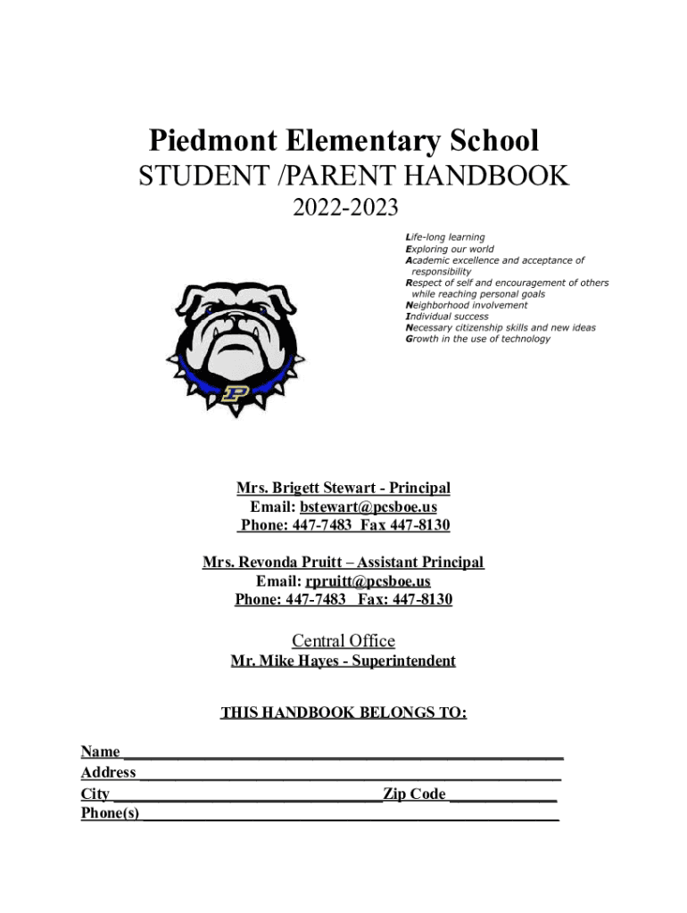 Piedmont Elementary School STUDENT /PARENT HANDBOOK 20222023Mrs. Bridgett Stewart Principal Email: bstewart@pcsboe.us Phone: 4477483 Fax 4478130 Mrs. Rhonda Pruitt Assistant Principal Email: rpruitt@pcsboe.us