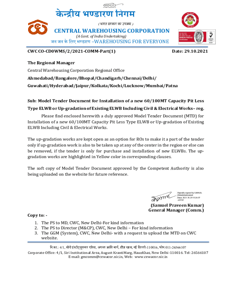 ()CENTRAL WAREHOUSING CORPORATION (A Govt. of India Undertaking) WAREHOUSING FOR EVERYONE CWC COCD0WMS/2/2021COMMPart(1)Date: 29.10.2021The Regional Manager Central Warehousing Corporation Regional