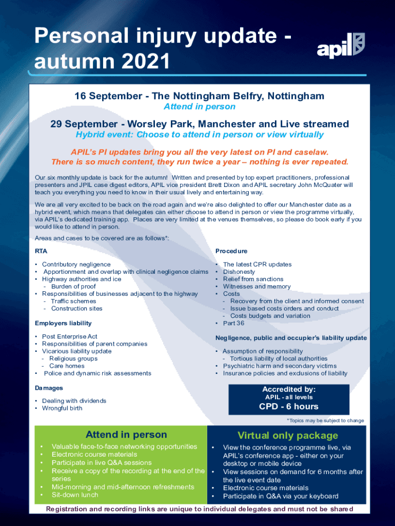 Personal injury update autumn 2021 16 September The Nottingham Belfry, Nottingham Attends in person29 September Worse Park, Manchester and Live streamed Hybrid event: Choose to attend in person or