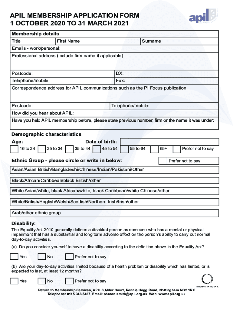 The apil membership application form is a document used to apply for membership with the Association of Personal Injury Lawyers (APIL).