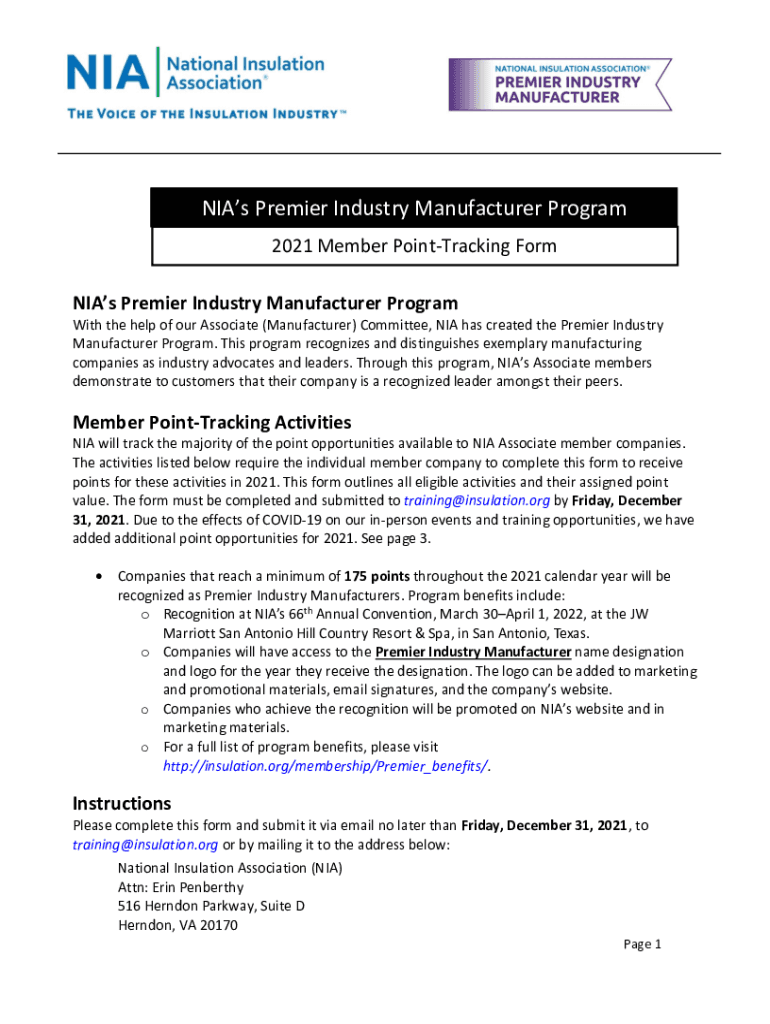 NIA's Premier Industry Manufacturer Program 2021 Member PointTracking Form NIA's Premier Industry Manufacturer Program With the help of our Associate (Manufacturer) Committee, NIA has created the