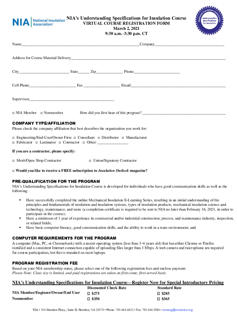 NIA's Understanding Specifications for Insulation Course VIRTUAL COURSE REGISTRATION FORM March 2, 2021 9:30 a.m.3:30 p.m. CT Name___Company___Address for Course Material Delivery___City___ State___
