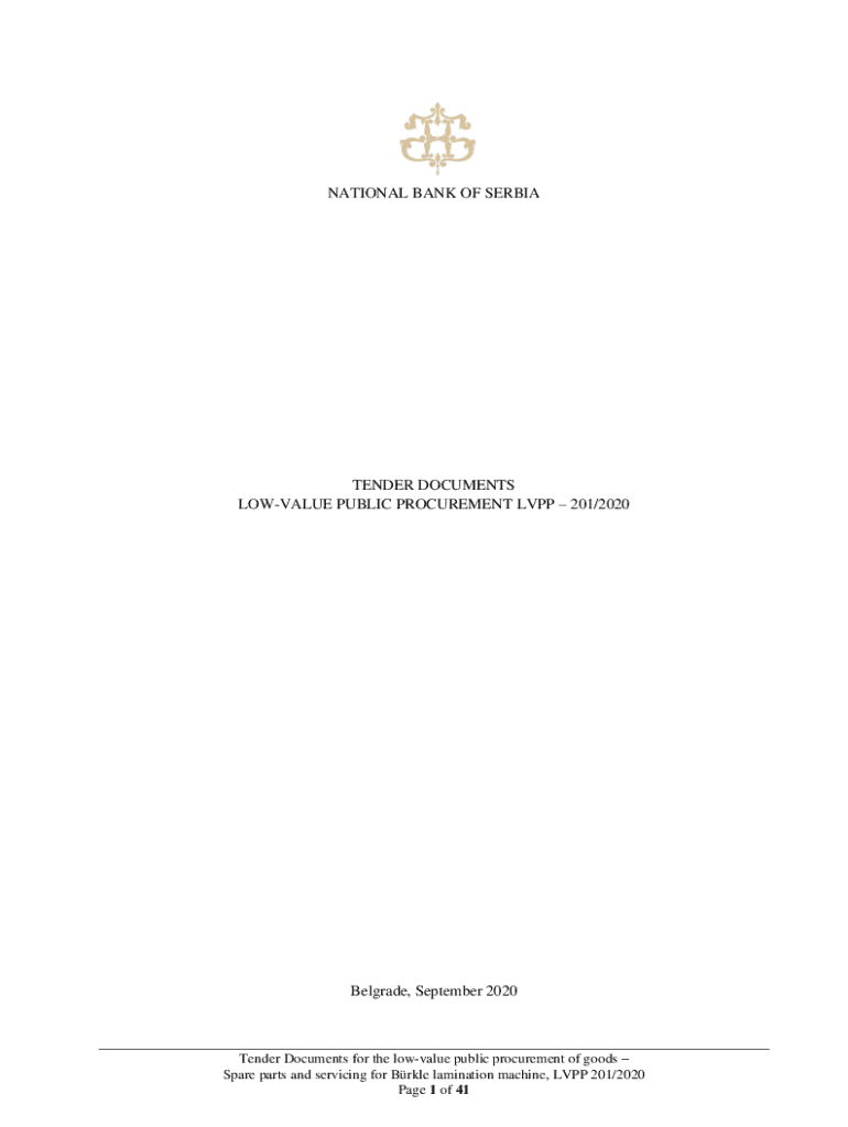NATIONAL BANK OF SERBIATENDER DOCUMENTS VALUE PUBLIC PROCUREMENT LPP 201/2020Belgrade, September 2020Tender Documents for the low value public procurement of goods Spare parts and servicing for Brulé