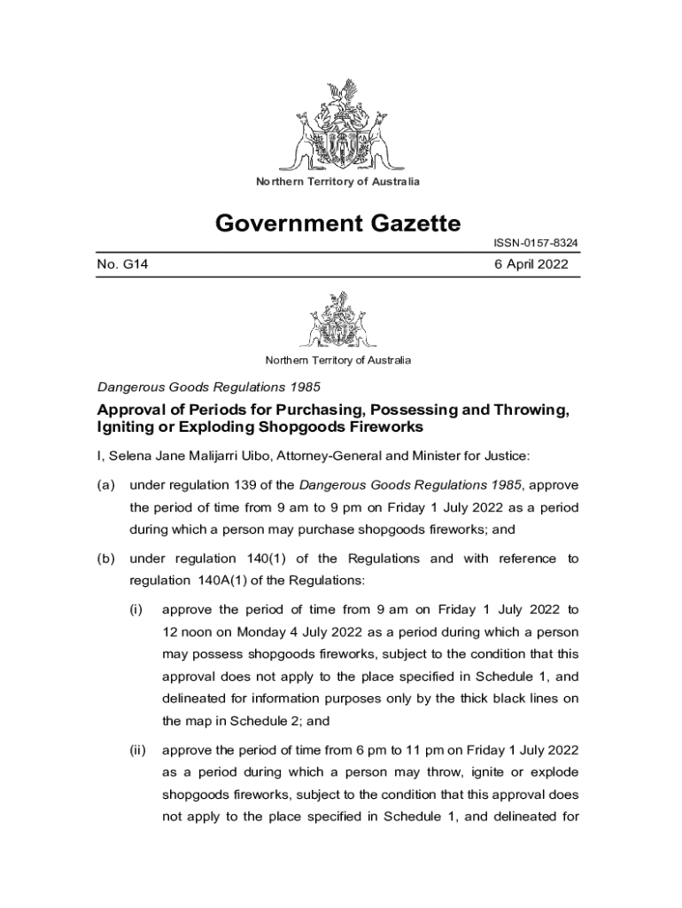 No. G14ISSN015783246 April 2022Northern Territory of AustraliaDangerous Goods Regulations 1985Approval of Periods for Purchasing, Possessing and Throwing,
