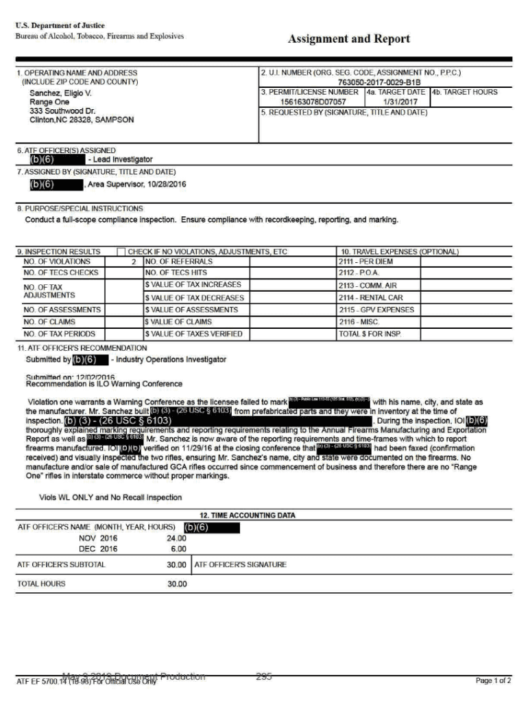 U.S. Department of Justice Bureau of Alcohol. Tobacco. Firearms and ExplosivesAssignment and Report 2 U I NUMBER (ORG. SEG. CODE, ASSIGNMENT NO., P.P.C.) 76305020170029B1B 3. PERMIT/LICENSE NUMBER