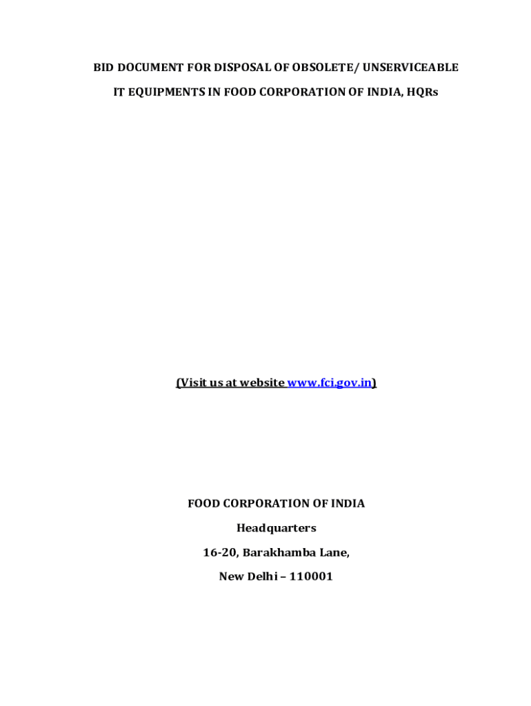 BID DOCUMENT FOR DISPOSAL OF OBSOLETE/ UNSERVICEABLE IT EQUIPMENTS IN FOOD CORPORATION OF INDIA, Hers(Visit us at website www.fci.gov.in)FOOD CORPORATION OF INDIA Headquarters 1620, Barakhamba Lane,