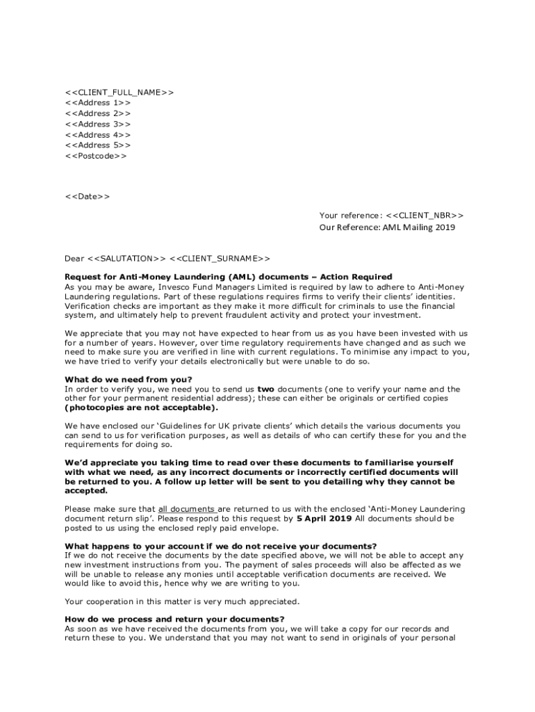 CLIENT_FULL_NAME Address 1 Address 2 Address 3 Address 4 Address 5 PostcodeDate Your reference: CLIENT_NBROur Reference: AML Mailing 2019 Dear SALUTATION CLIENT_SURNAMERequest for Antimony Laundering