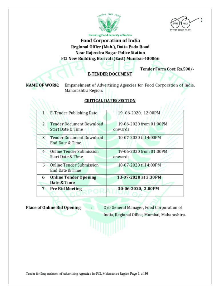 Ensuring Food Security of Nationhood Corporation of India Regional Office (MAH.), Data Pad Road Near Rajendra Nagar Police Station FCI New Building, Arrival (East) Mumbai400066 TENDER DOCUMENT NAME