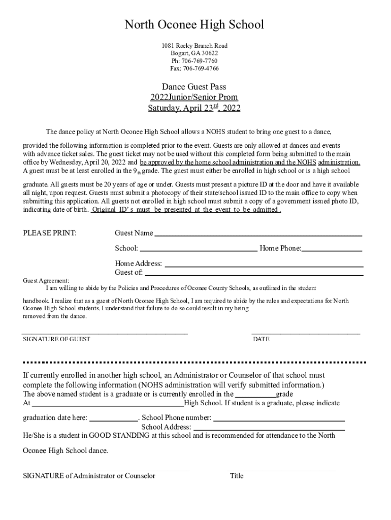 North Ocoee High School 1081 Rocky Branch Road Bogart, GA 30622 pH: 7067697760 Fax: 7067694766Dance Guest Pass 2022Junior/Senior Prom Saturday, April 23 rd, 2022 The dance policy at North Ocoee High