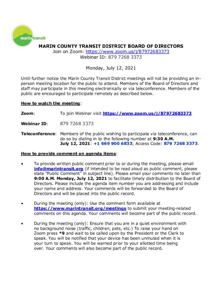 MARIN COUNTY TRANSIT DISTRICT BOARD OF DIRECTORS Join on Zoom: https://www.zoom.us/j/87972683373 Webinar ID: 879 7268 3373 Monday, July 12, 2021, Until further notice the Marin County Transit District