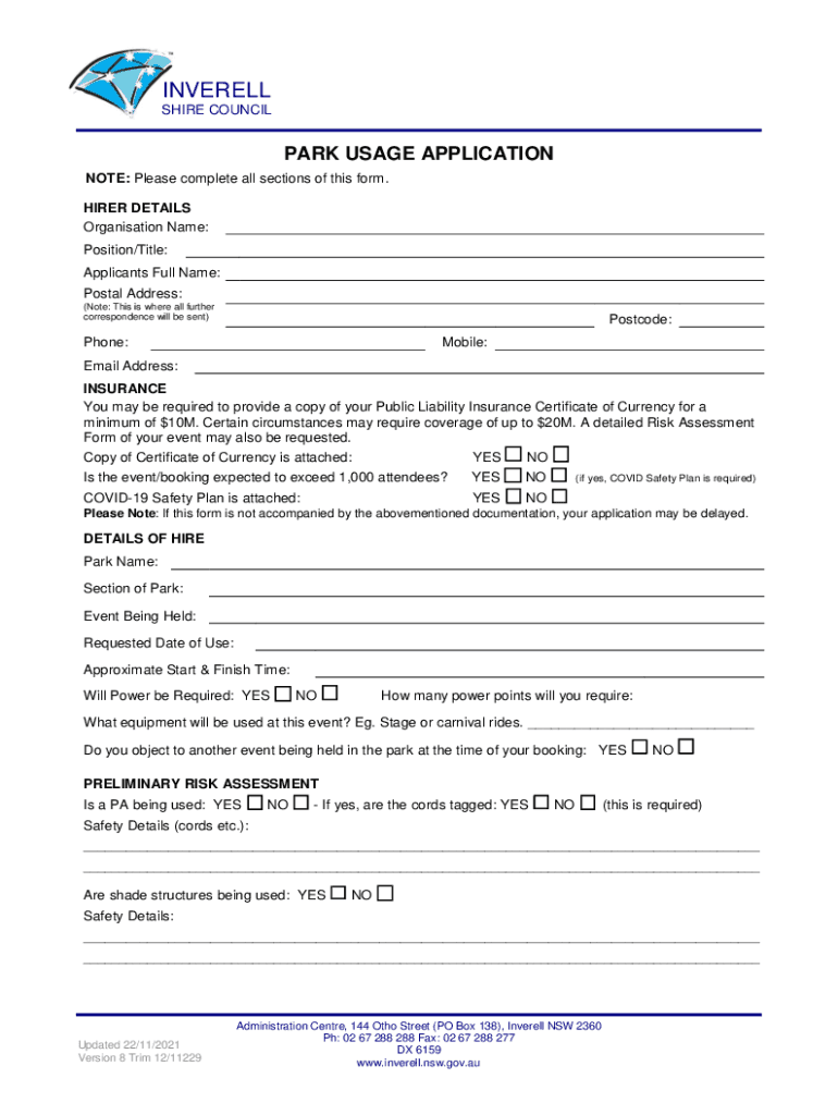 INVERSELY SHIRE COUNCILMAN USAGE APPLICATION NOTE: Please complete all sections of this form. HIRED DETAILS Organization Name: Position/Title: Applicants Full Name: Postal Address: (Note: This is