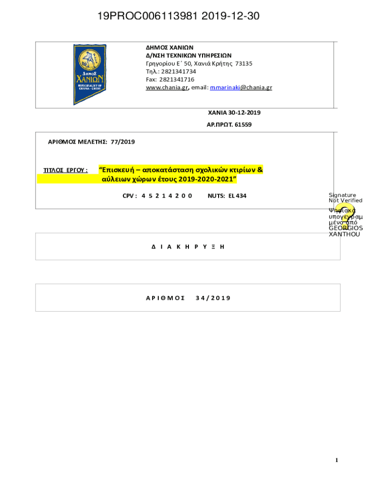 19PROC006113981 20191230 / 50, 73135.: 2821341734 Fax: 2821341716 www.chania.gr, email: mmarinaki@chania.gr 30122019. 61559 : 77/2019 : & 201920202021 CPV : 4 5 2 1 4 2 0
