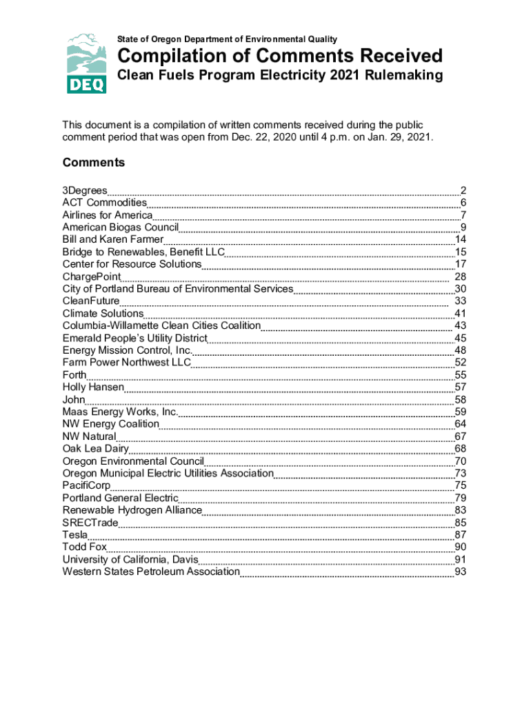 State of Oregon Department of Environmental QualityCompilation of Comments Received Clean Fuels Program Electricity 2021 Rule making This document is a compilation of written comments received during