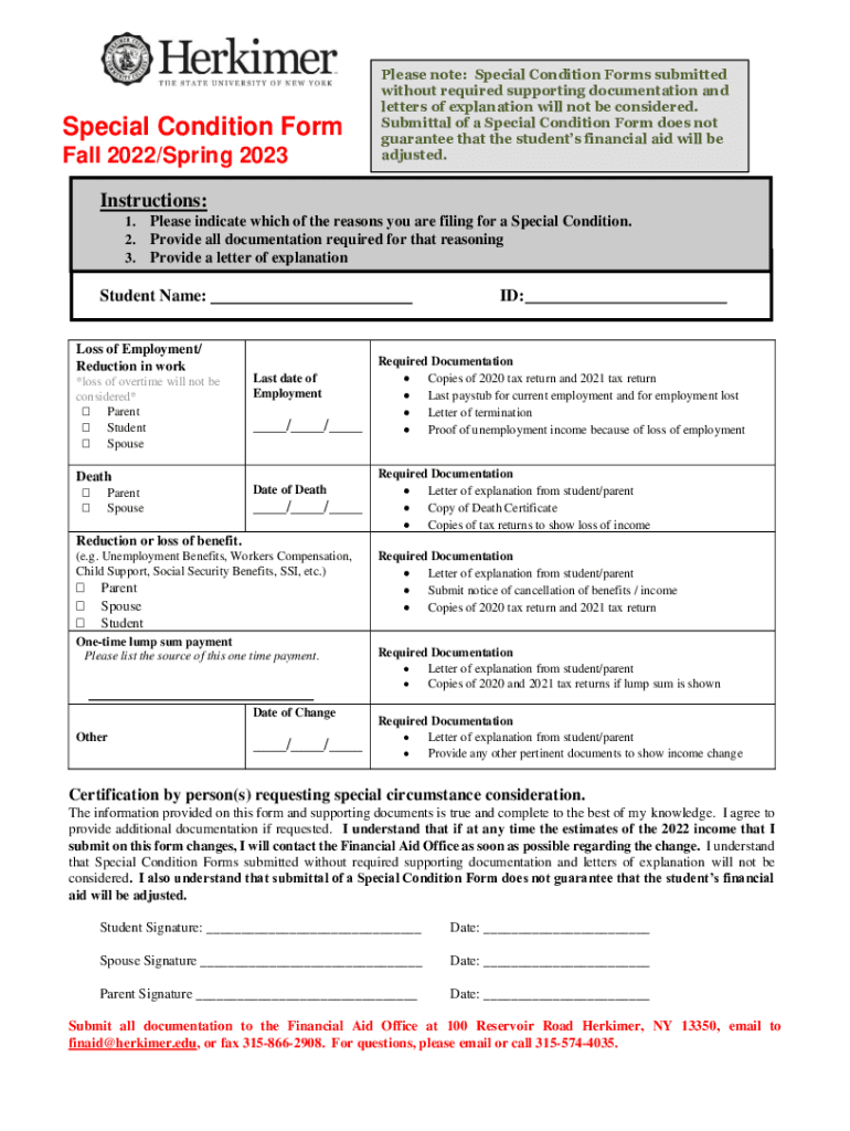 Special Condition Form Fall 2022/Spring 2023Please note: Special Condition Forms submitted without required supporting documentation and letters of explanation will not be considered. Submittal of