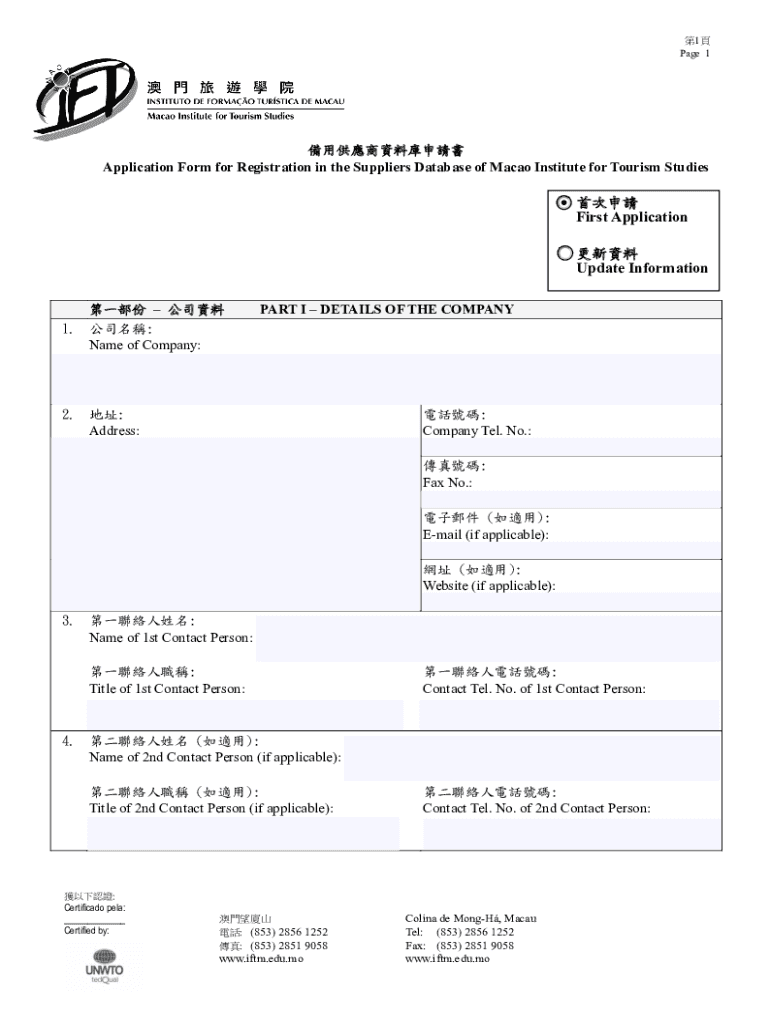 1-Page 1 Application Form for Registration in the Suppliers Database of Macao Institute for Tourism Studies First Application Update Information 1. Name of Company:PART I DETAILS OF THE COMPANY2.