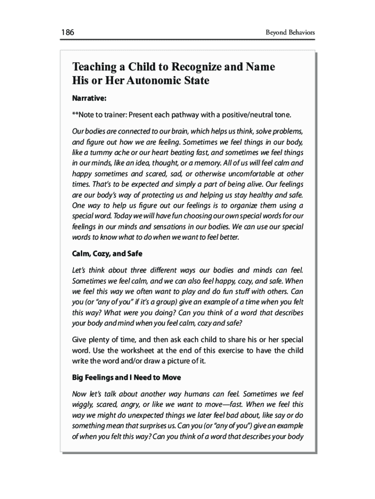 186Beyond BehaviorsTeaching a Child to Recognize and Name His or Her Autonomic State Narrative: **Note to trainer: Present each pathway with a positive/neutral tone. Our bodies are connected to our