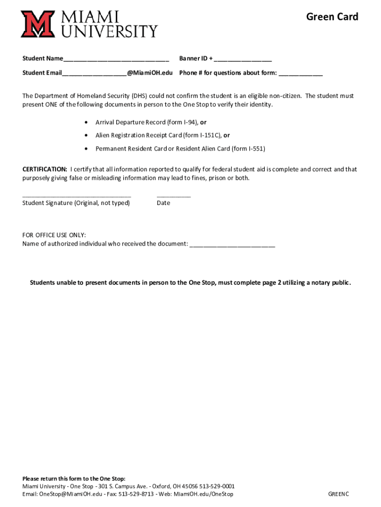 Green CardStudent Name___Banner ID + ___Student Email___@MiamiOH.edu Phone # for questions about form: ___ The Department of Homeland Security (DHS) could not confirm the student is an eligible noncitizen.