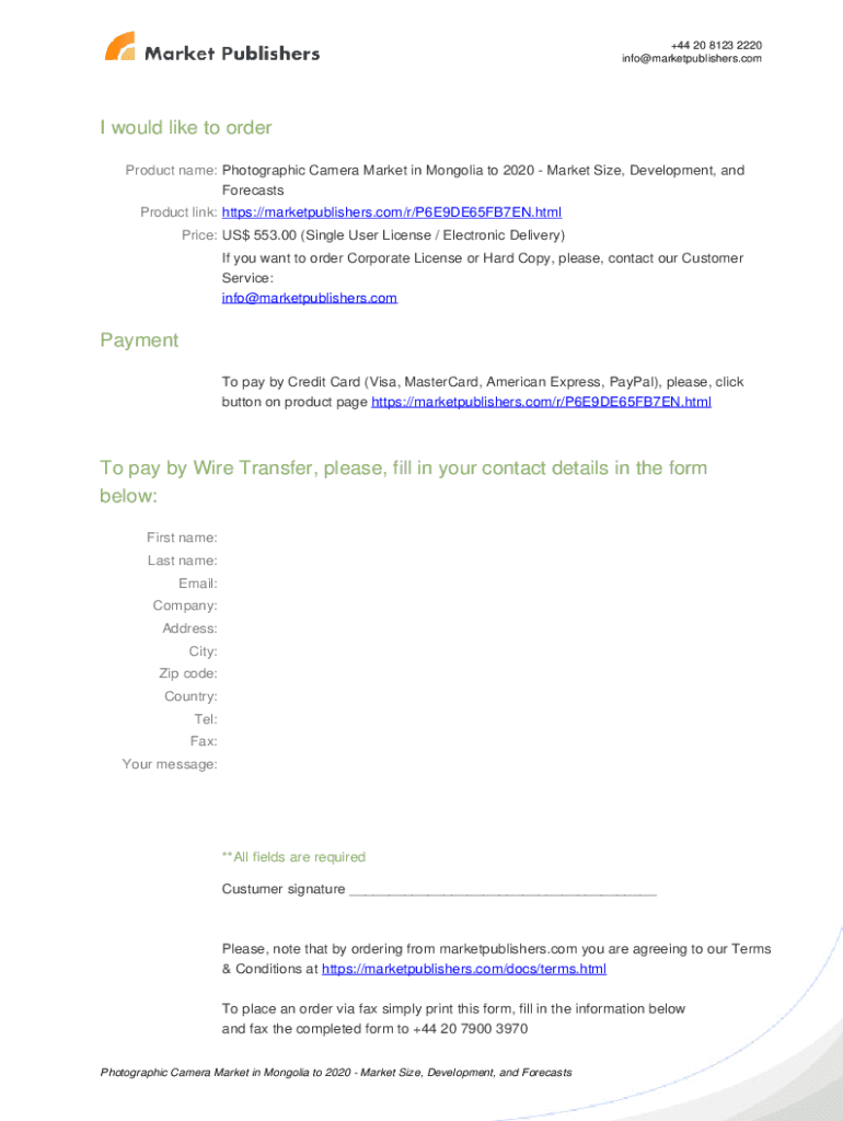 +44 20 8123 2220 info@marketpublishers.comPhotographic Camera Market in Mongolia to 2020 Market Size, Development, and Forecasts https://marketpublishers.com/r/P6E9DE65FB7EN.html Date: June 2016 Pages: