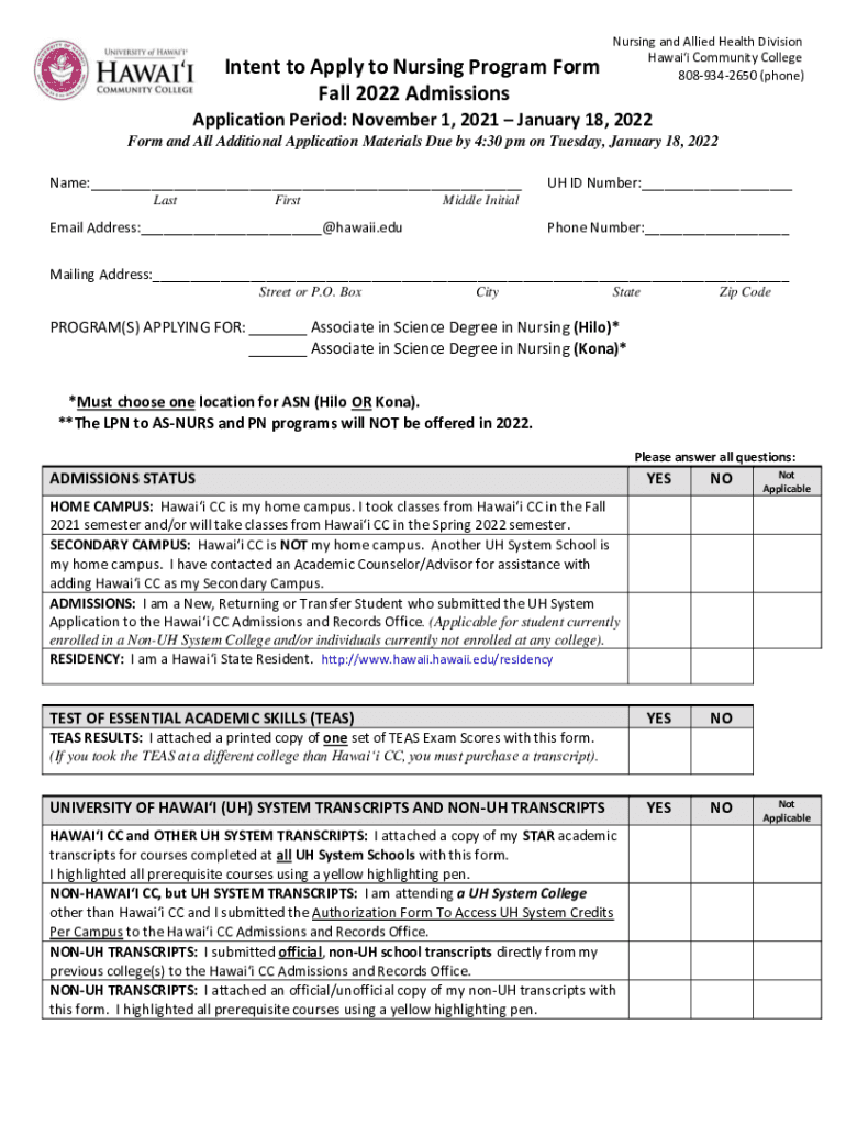 Intent to Apply to Nursing Program Form Fall 2022 AdmissionsNursing and Allied Health Division Hawaii Community College 8089342650 (phone)Application Period: November 1, 2021, January 18, 2022, Form