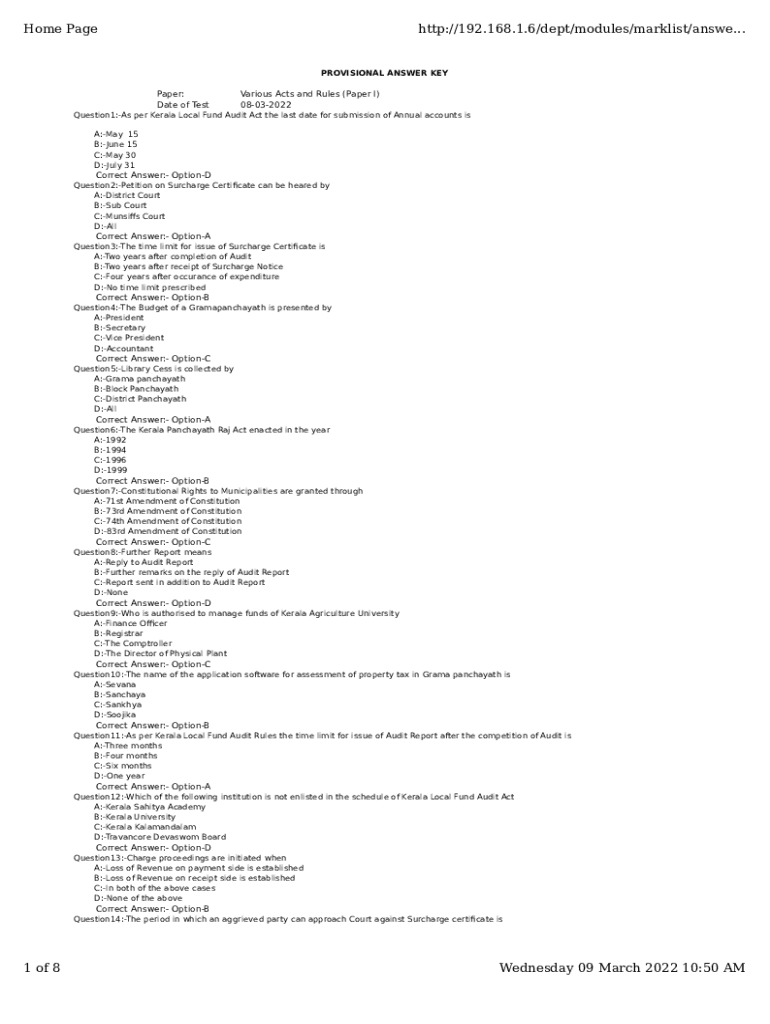 Home Pagehttp://192.168.1.6/dept/modules/mark list/answer...PROVISIONAL ANSWER Flypaper: Date of TestVarious Acts and Rules (Paper I) 08032022Question1:As per Kerala Local Fund Audit Act the last