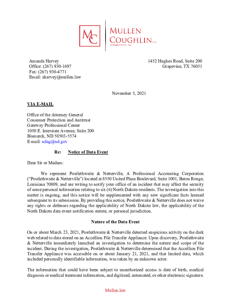 Amanda Harvey Office: (267) 9301697 Fax: (267) 9304771 Email: aharvey@mullen.law1452 Hughes Road, Suite 200 Grapevine, TX 76051November 5, 2021 VIA EMAIL Office of the Attorney General Consumer Protection