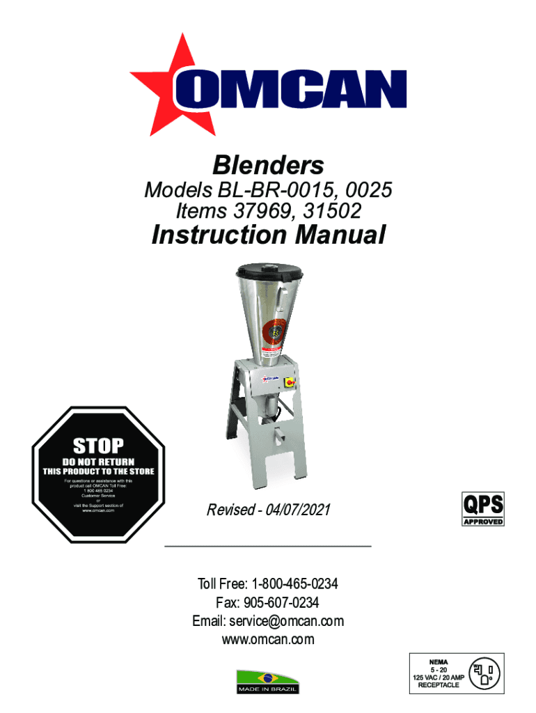 BlendersModels BLBR0015, 0025 Items 37969, 31502Instruction ManualRevised 04/07/2021Toll Free: 18004650234 Fax: 9056070234 Email: service@omcan.com www.omcan.comTable of Contents Model BLBR0015 /