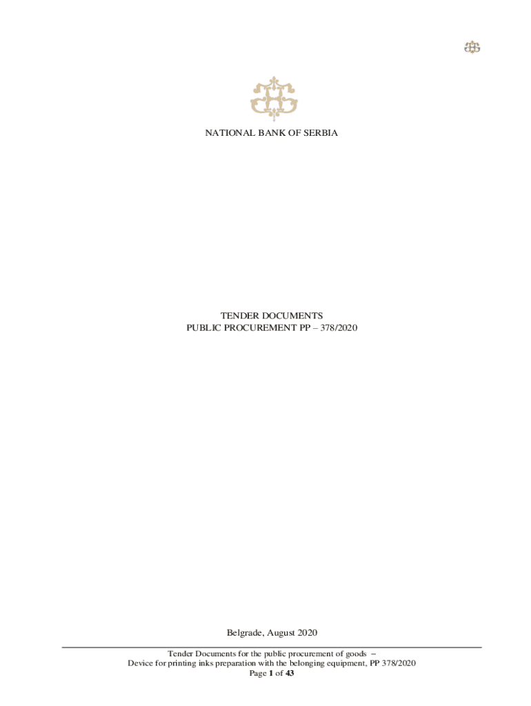 NATIONAL BANK OF SERBIATENDER DOCUMENTS PUBLIC PROCUREMENT PP 378/2020Belgrade, August 2020 Tender Documents for the public procurement of goods Device for printing inks preparation with the belonging