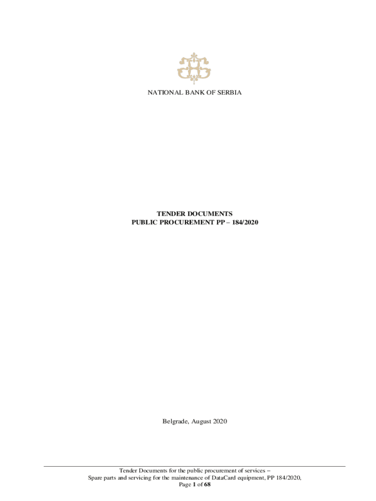 NATIONAL BANK OF SERBIATENDER DOCUMENTS PUBLIC PROCUREMENT PP 184/2020Belgrade, August 2020Tender Documents for the public procurement of services Spare parts and servicing for the maintenance of