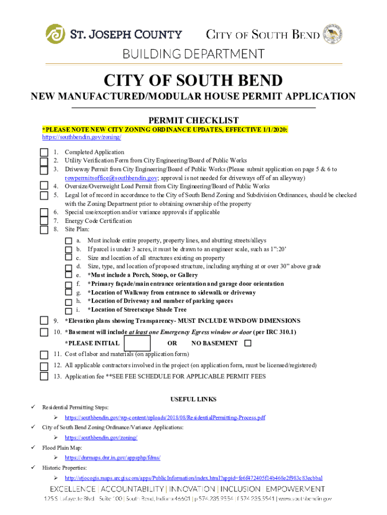 CITY OF SOUTH BENDER MANUFACTURED/MODULAR HOUSE PERMIT APPLICATION PERMIT CHECKLIST×PLEASE NOTE NEW CITY ZONING ORDINANCE UPDATES, EFFECTIVE 1/1/2020: https://southbendin.gov/zoning/ 1. 2. 3. 4.