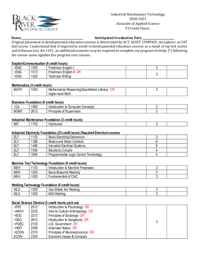 Industrial Maintenance Technology 20202021 Associate of Applied Science 59 Credit Hours Name___ Anticipated Graduation Date ___ Original placement in developmental education courses is determined