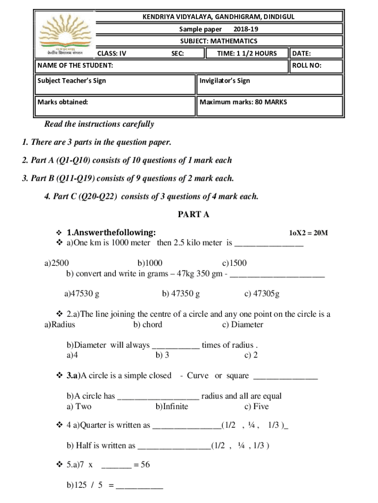 KENDRA HIMALAYA, GANDHIAN, INDIGO? Sample paper201819SUBJECT: MATHEMATICS CLASS: IV SEC:TIME: 1 1/2 SURNAME OF THE STUDENT:DATE: ROLL NO:Subject Teachers SignInvigilators Sign Marks obtained:Maximum