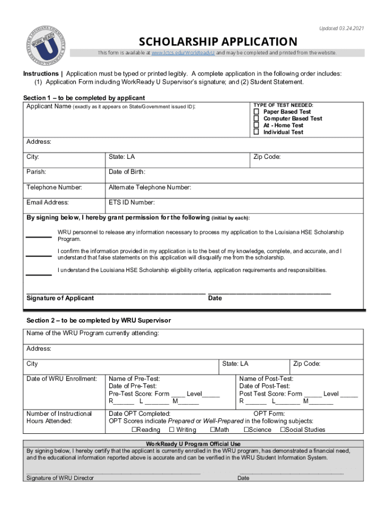 Updated 03.24.2021SCHOLARSHIP APPLICATION This form is available at www.lctcs.edu/WorkReadyU and may be completed and printed from the website. Instructions | Application must be typed or printed
