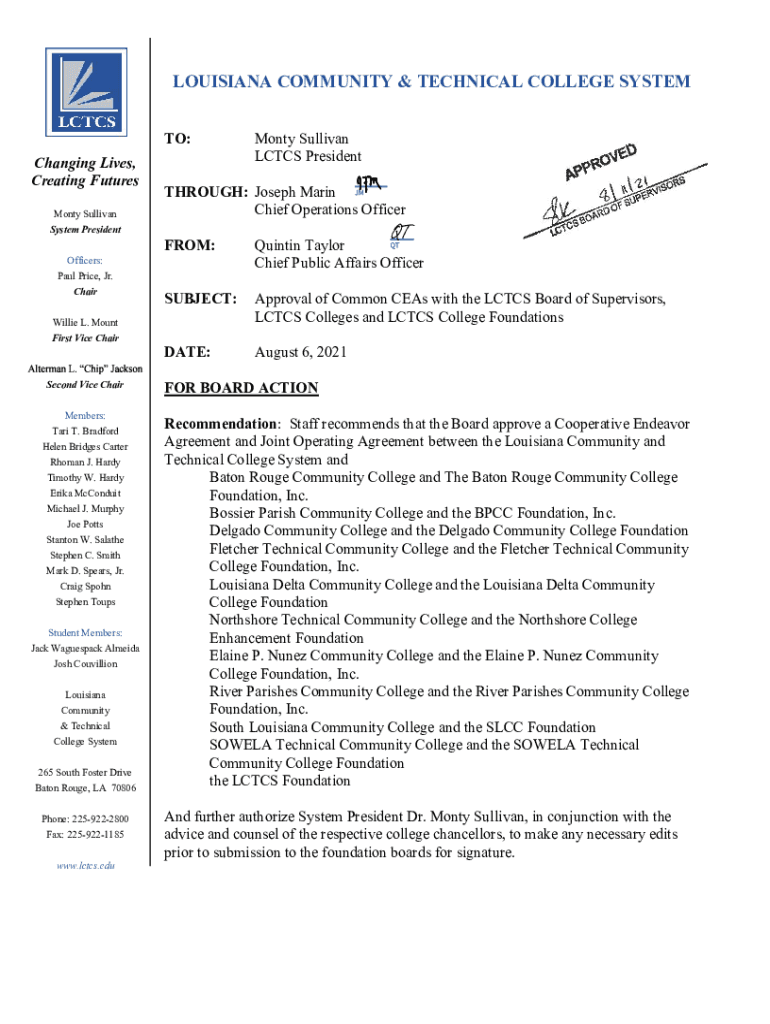 LOUISIANA COMMUNITY & TECHNICAL COLLEGE SYSTEM TO: Changing Lives, Creating Futures Monty Sullivan System President Officers: Paul Price, Jr. Wherethrough: Joseph Marin Chief Operations Officer FROM:Quentin