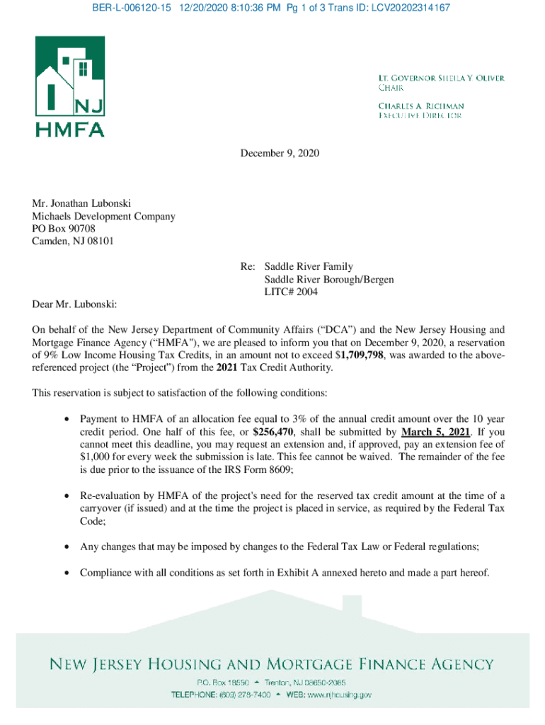 BERL00612015 12/20/2020 8:10:36 PM Pg 1 of 3 Trans IDs: LCV20202314167December 9, 2020Mr. Jonathan Bonsai Michael's Development Company PO Box 90708 Camden, NJ 08101 Re: Saddle River Family Saddle