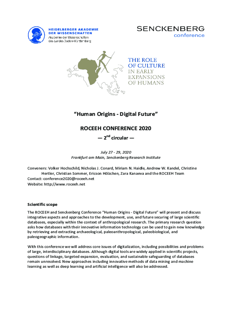 Human Origins Digital Future ROCKET CONFERENCE 2020 2nd circular July 27 29, 2020 Frankfurt am Main, Senckenberg Research Institute Conveners: Volker Rothschild, Nicholas J. Conrad, Miriam N. Handle,