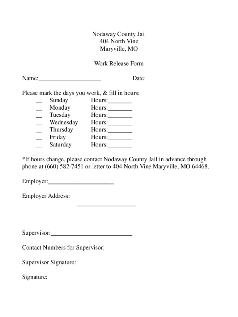 Nod away County Jail 404 North Vine Maryville, MO Work Release Form Name:Date:Please mark the days you work, & fill in hours: __ Sunday Hours: __ Monday Hours: __ Tuesday Hours: __ Wednesday Hours:
