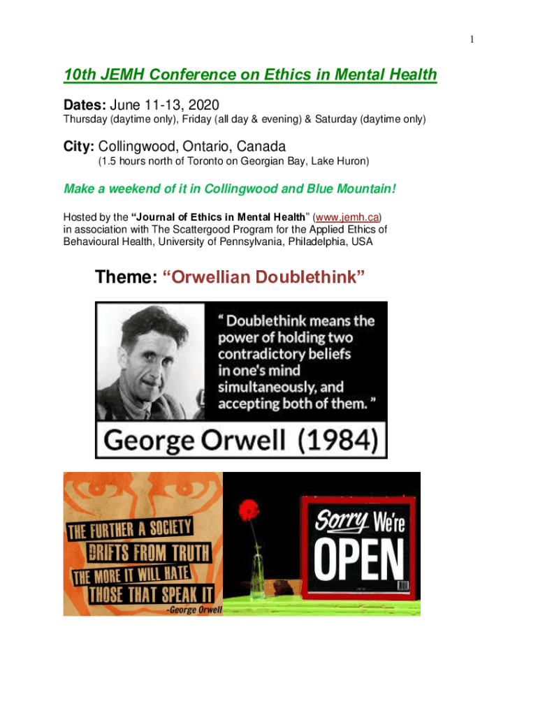 110th JE MH Conference on Ethics in Mental Health Dates: June 1113, 2020 Thursday (daytime only), Friday (all day & evening) & Saturday (daytime only)City: Collingwood, Ontario, Canada (1.5 hours