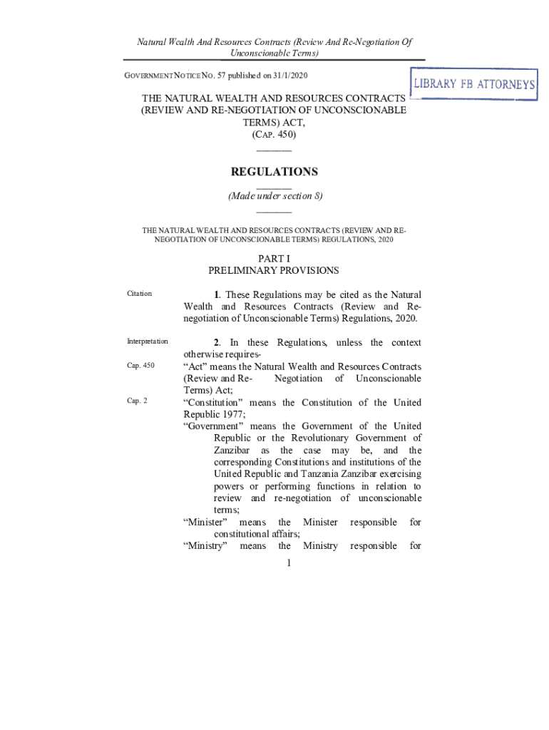 Natural Wealth And Resources Contracts (Review And Renegotiation Of Unconscionable Terms) GN. NO. 57 (Contd.) GOVERNMENT NOTICE NO. 57 published on 31/1/2020THE NATURAL WEALTH AND RESOURCES CONTRACTS