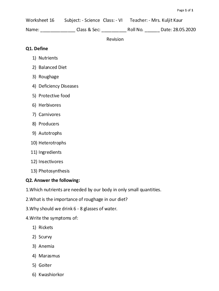 Page 1 of 1Worksheet 16Subject: Science Class: Teacher: Mrs. Kuwait Surname: ___ Class & Sec: ___ Roll No. ___ Date: 28.05.2020 Revision Q1. Define 1) Nutrients 2) Balanced Diet 3) Roughage 4) Deficiency