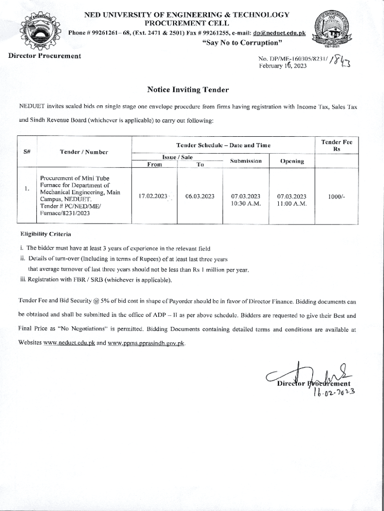 Get the free Notice Inviting Tender (PC/NED/ME/Furnace/8231/2023)